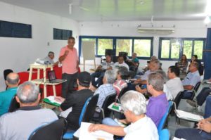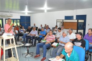 O instrutor Rosenilton Macedo diz que “o que estamos fazendo nesse momento é atualizando os diversos técnicos dos escritórios locais nas práticas agronômicas para falar sobre os clones, cada clone de porte alto, porte pequeno, porte médio, onde cada clone pode ser colocado, na baixada, no terço médio, no alto, falar sobre a fertilidade de solos, correção com calagem, gessagem, aplicação de fertilizantes, manejo, questão de sombreamento, direcionamento da correção de sombra no sentido leste oeste etc. então é um conjunto de práticas para serem desenvolvidas na atividade de cacau com ênfase na alta produtividade, que é perfeitamente alcançável”.